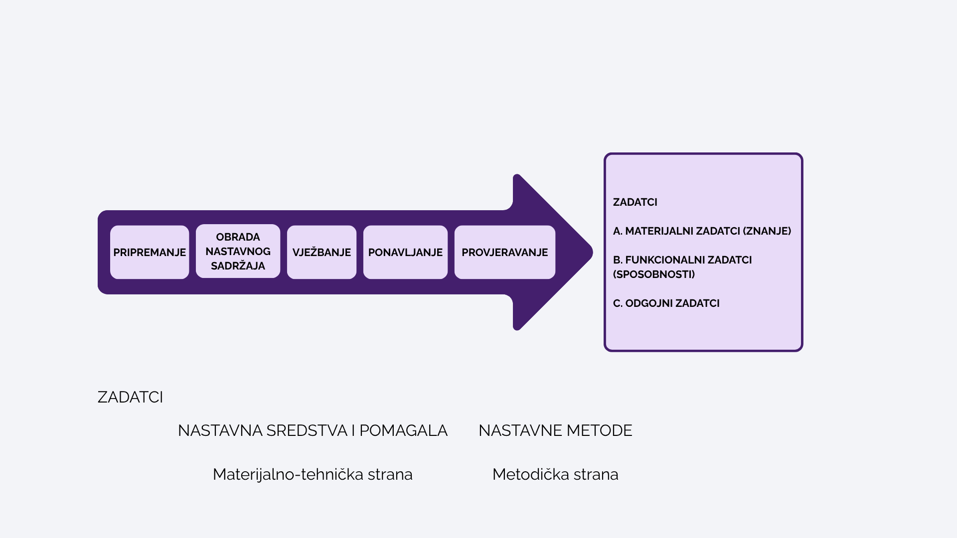 Iz grafičkog prikaza proizlazi da nastavni proces u cjelini, pa tako i pojedina njegova etapa, ima materijalno-tehničku stranu, spoznajnu stranu, psihološku stranu i metodičku stranu s brojnim elementima koji se nižu sukcesivno, ali i simultano integriraju u pojedinoj etapi nastavnog procesa kao njezini mikroelementi.