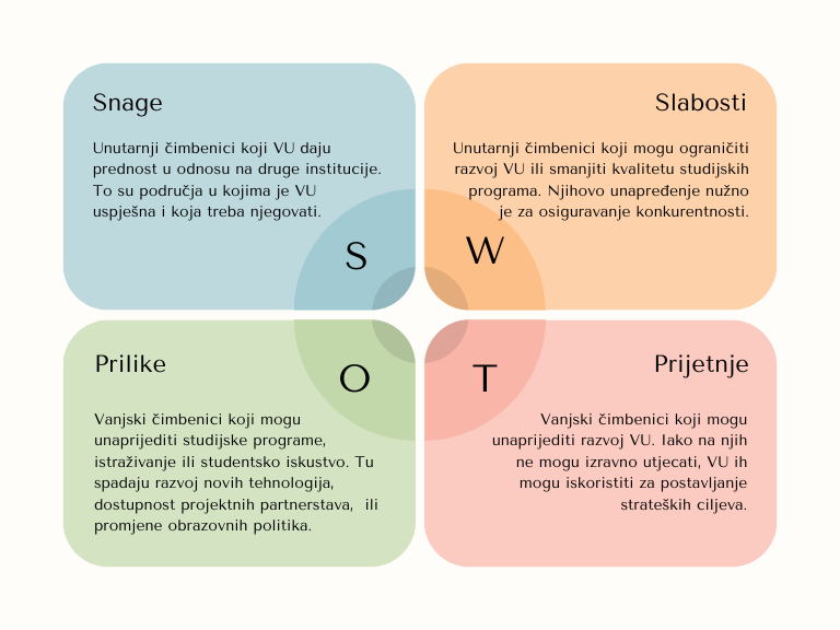 SWOT analiza je analitički okvir koji omogućuje sustavno prepoznavanje prednosti, slabosti, prilika i prijetnji. U akademskom okruženju primjenjuje se na razini institucije, studijskog programa ili pojedinog projekta, s ciljem procjene njihove usklađenosti s obrazovnim strategijama i razvojnim ciljevima i vrednovanja kvalitete provedbe nastavnih i istraživačkih aktivnosti.