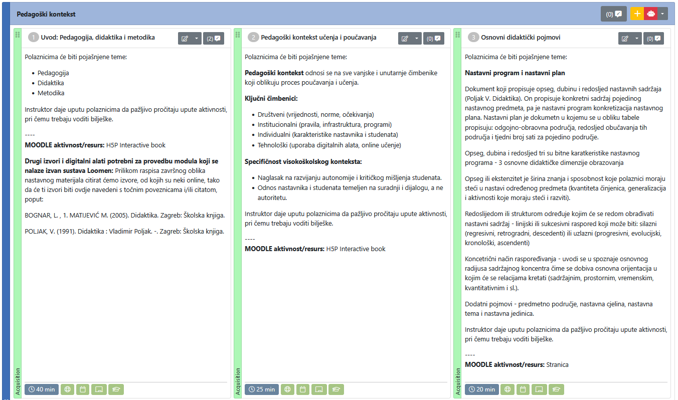 Layout of the BDP tool with a display of individual activities, their content, type of execution, type of MOODLE activity/resource, and the like.