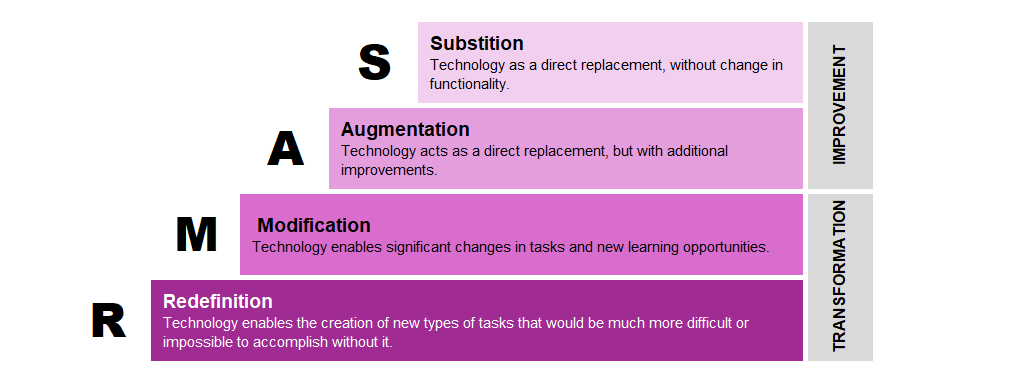 The SAMR model was developed in 2010 by Ruben Puentedura and consists of four levels of online learning, roughly ranked according to their transformative power. SAMR is a reflection tool that can help teachers think about how the integration of digital technology supports learning in specific educational contexts/situations and activities. The abbreviation "SAMR" stands for Substitute (en. substitution), Expansion (en. augmentation), Reshaping (en. modification) i Redefinition (en. redefinition).