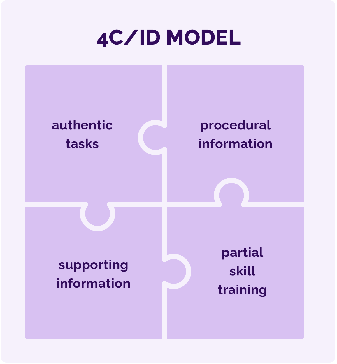 The 4C/ID model focuses on developing complex competencies through four basic components: authentic tasks, procedural information, supporting information and partial skill practice. It is based on the idea that complex competencies are best developed by solving tasks that reflect real-world challenges, with gradually decreasing support as the student progresses.