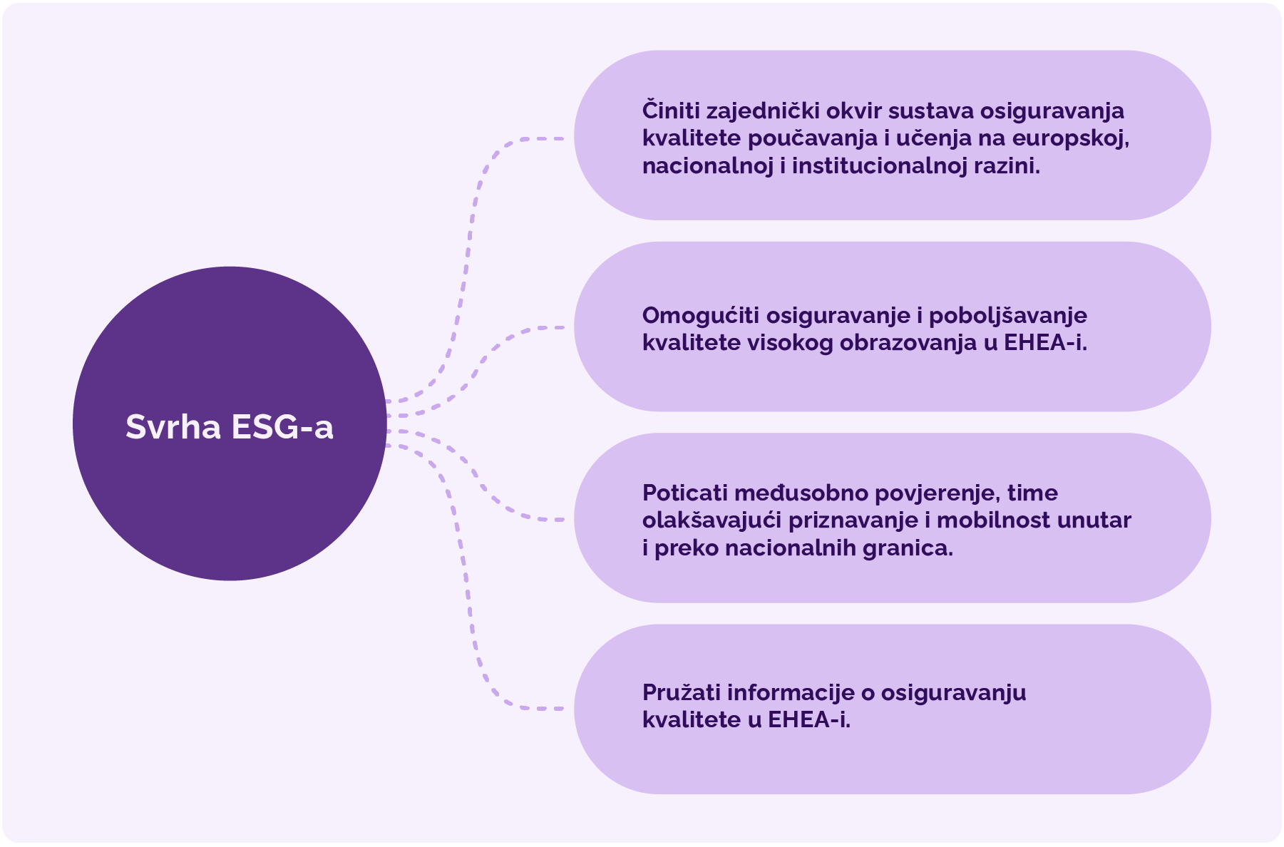 ESG se prije svega bavi osiguravanjem kvalitete u visokom obrazovanju: kako se poučava, kako studenti uče i kakvo okruženje za učenje pružamo. Obuhvaća i povezanost sa znanošću, inovacijama te procese kojima visoka učilišta stalno unapređuju svoj rad, istraživanje i upravljanje.