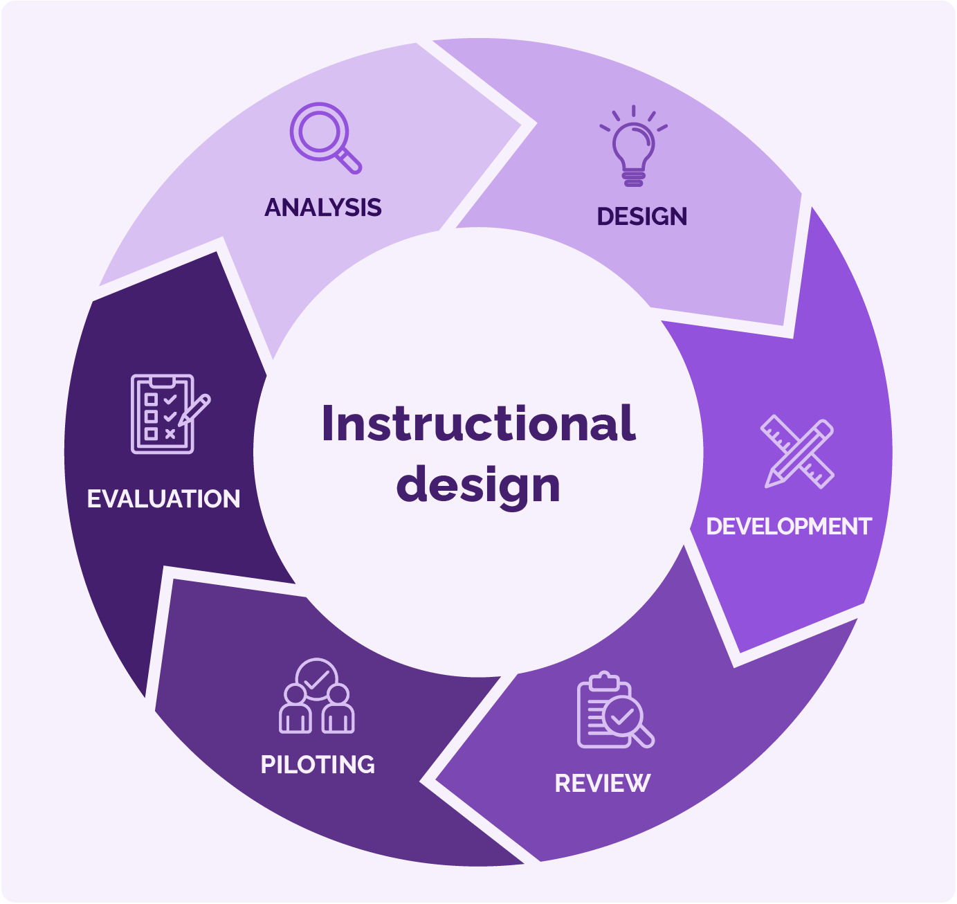 Instructional design is a systematic process of analyzing learning needs, defining goals, and designing, developing, implementing, and evaluating teaching materials and activities. It starts from basic pedagogical theories (cognitivism, constructivism, behaviorism) and applies them in a concrete context in order to achieve clear learning outcomes.