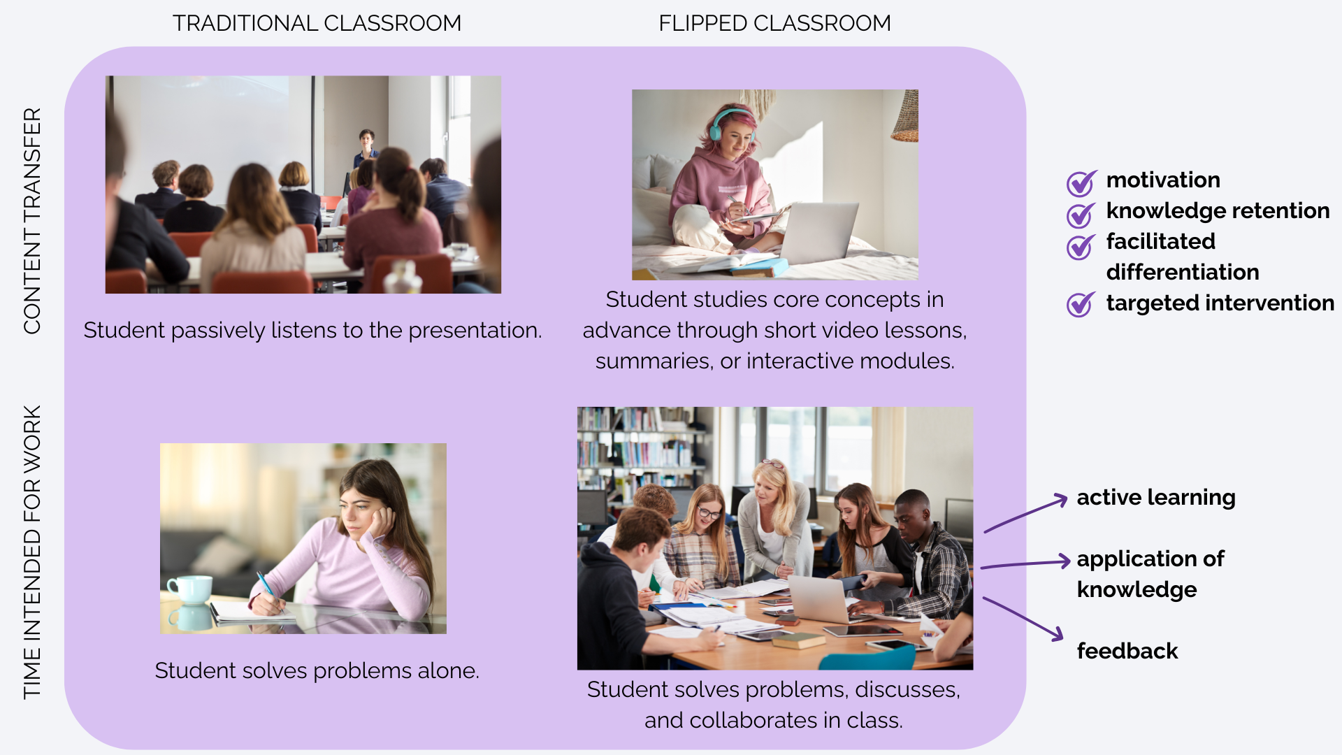 This arrangement emphasizes more cognitively demanding activities during the session, while basic familiarization with concepts occurs at a pace that the student can adjust (pause, rewinding the video or audio recording, additional materials and online resources). This increases motivation and retention of knowledge and facilitates differentiation, which allows the teacher to more quickly see where someone is "stuck" and facilitates targeted intervention.