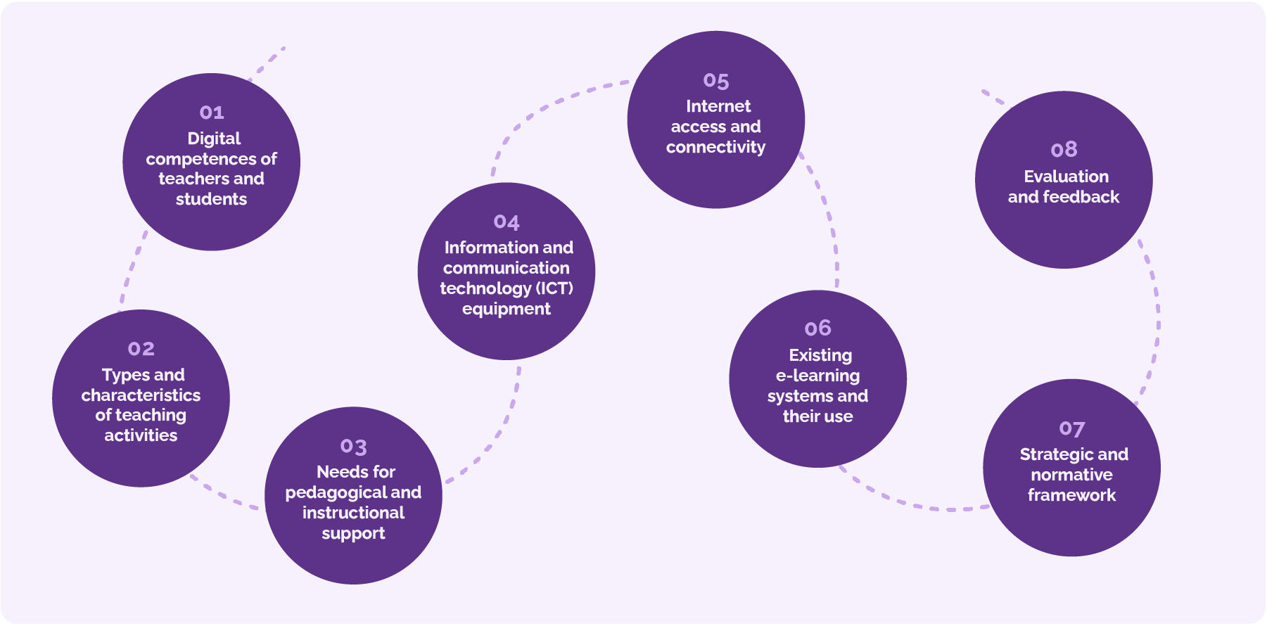 Such an analysis should be comprehensive and encompass a few interrelated aspects that together shape the conditions for the successful introduction and further development of digitally supported education. Key elements to consider include technical infrastructure (computer and network equipment, internet availability, software support), digital competences of teaching and non-teaching staff, students' readiness to learn in a digital environment, organisational structure and institutional support for e-learning, existing pedagogical practices and the alignment of the e-learning strategy with the mission and vision of the institution.