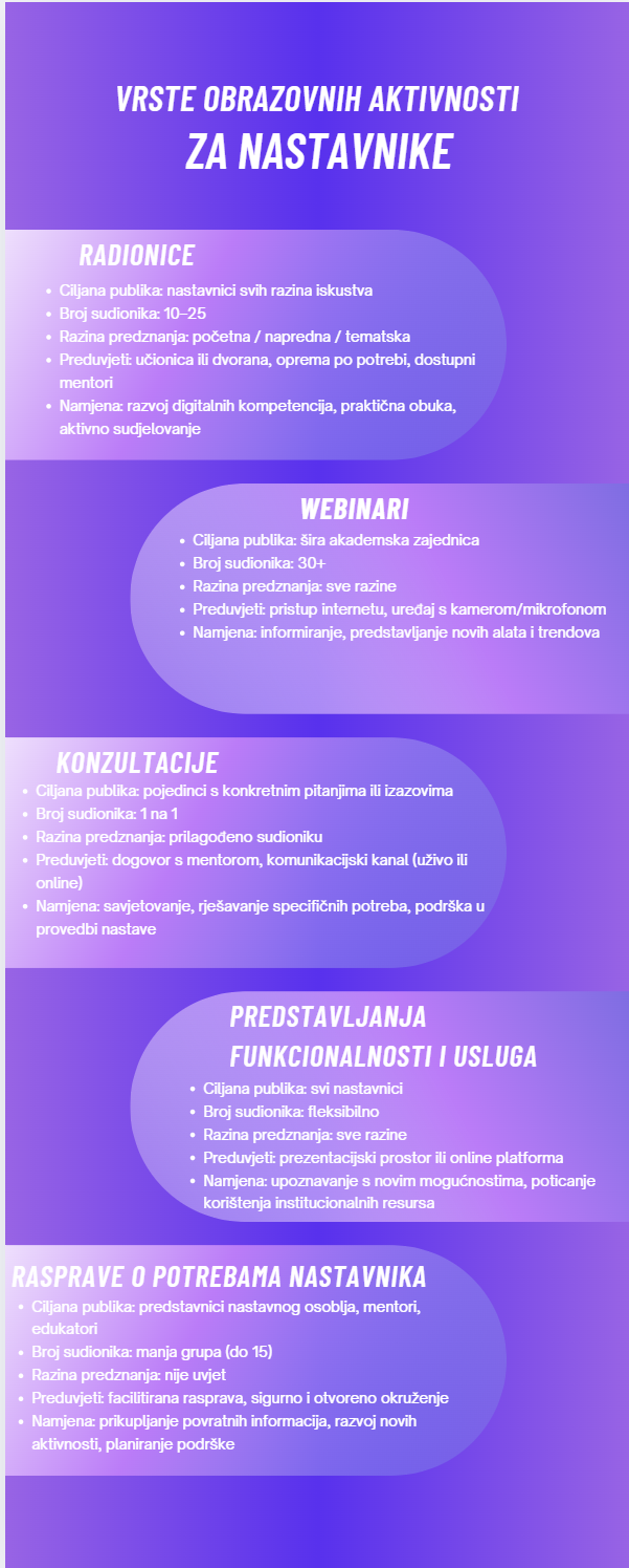 Ovdje možete vidjeti infografiku "Vrste obrazovnih aktivnosti za nastavnike". Uočite vrste aktivnosti i brojnost ciljane publike te ostale karakteristike aktivnosti.