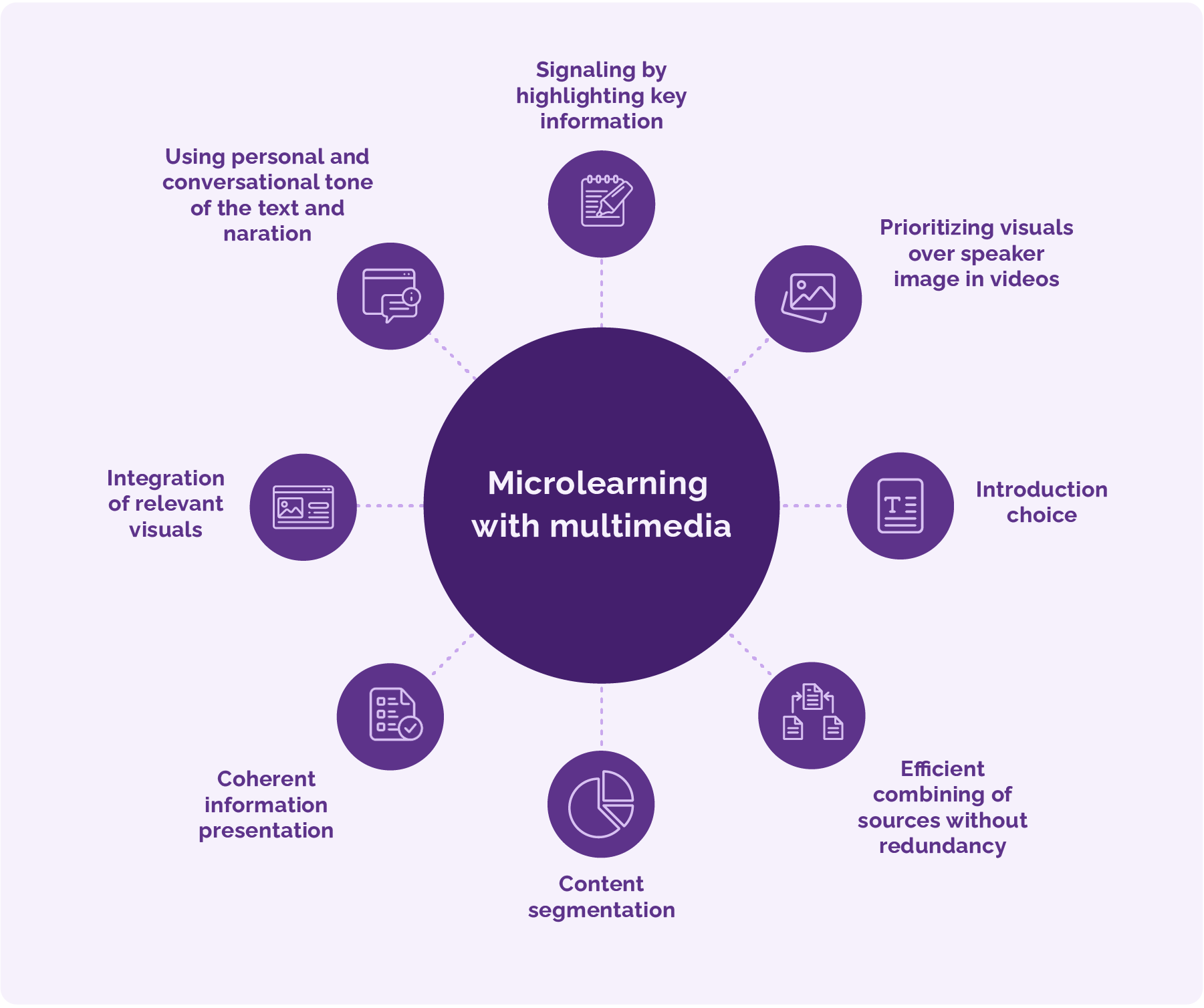 In microlearning, where content is broken down into short, targeted chunks, the use of multimedia has a major impact on learning quality. Research shows that students learn more effectively when on-screen text is combined with relevant visuals than when text alone is presented. Images, graphs, and illustrations can enhance understanding and support memory, but they must be carefully integrated to genuinely reinforce the message.